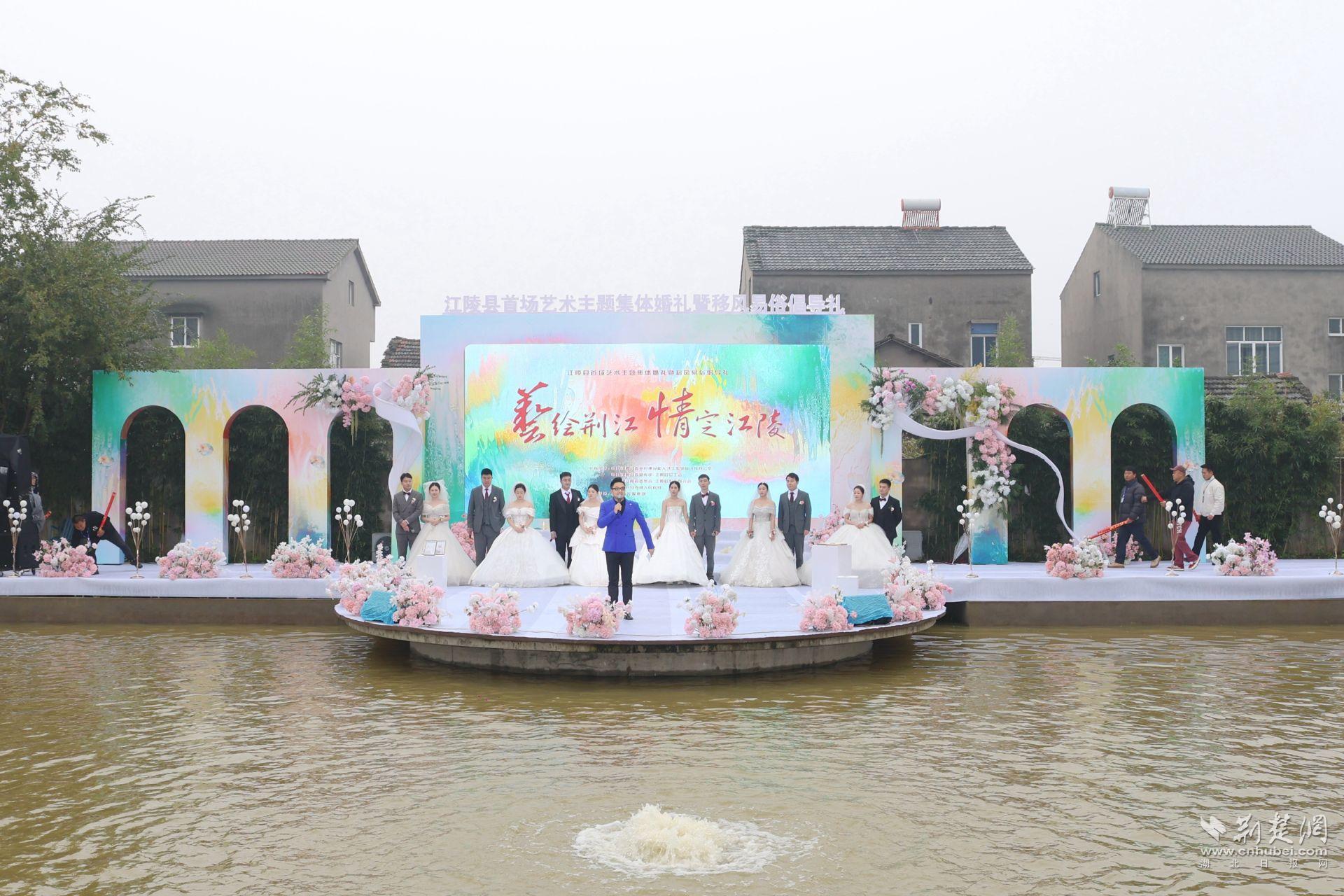 首场艺术主题集体婚礼在荆州当地音乐家王一燕的《把爱留在荆州》和《改写人生》的优美曲调中拉开帷幕。六对新人以简单而隆重的仪式实践了新的婚礼习俗。青年代表宣读《婚俗文明倡议书》;新人携手宣读结婚誓词、交换戒指,分享相知相爱的甜蜜与幸福;特邀见证人陈泽坤将大家的集体涂鸦重新创作成油画作品《证明爱情的图画》;而书法家以墨为情,以笔为证为每对新人书写专属的婚礼祝福,将传统文化与现代婚礼习俗完美融合。