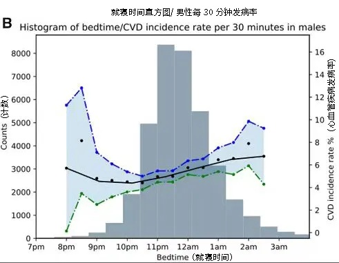 研究人员平均跟踪了他们 5.7 年,发现了 3,172 个(3.58%)由心血管疾病引起的主题,包括心肌梗塞、心力衰竭、慢性缺血性心脏病、中风和短暂性脑缺血发作。在这些患有心血管疾病的患者中,43%的人在清晨或更晚睡觉,38%的人在23:00至24:00之间睡觉,而只有15%的人在22:00至23:00之间睡觉,4%的人在22:00之前睡觉。